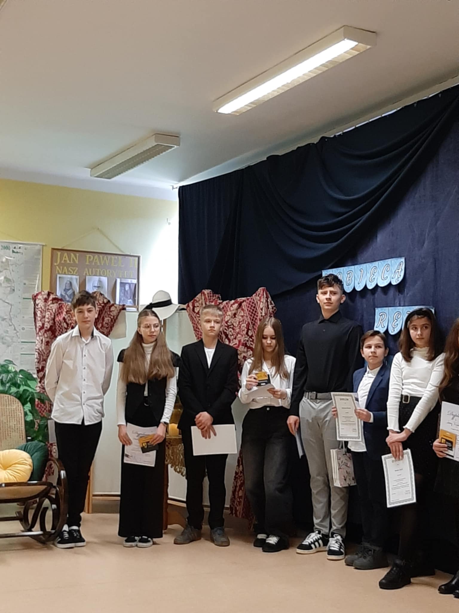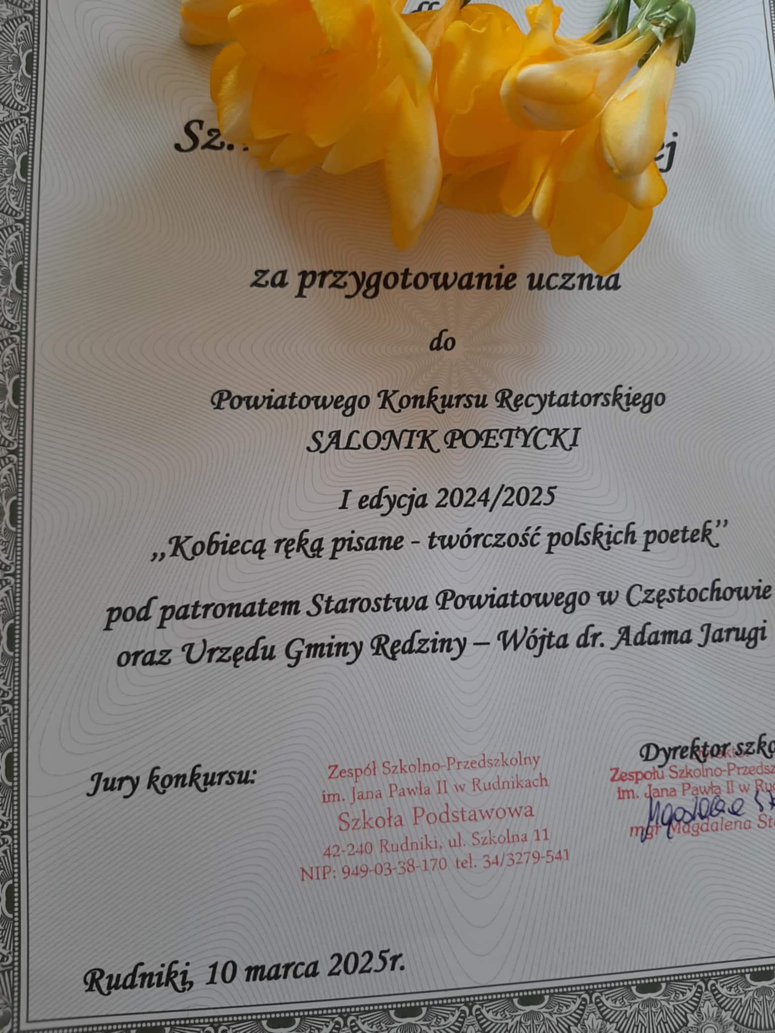 W I Powiatowym Konkursie Recytatorskim „Salonik poetycki” organizowanym przez ZSP w Rudnikach uczeń klasy VII naszego zespołu Ignacy Łachmański zajął II miejsce. Zarecytował wiersz polskiej noblistki „Allegro ma non troppo”. Gratulacje składamy Ignacemu i organizatorom, czekając na kolejną edycję konkursu.