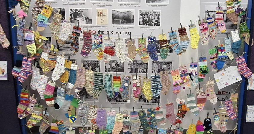 Klasy I-III stworzyły przepiękne kartonowe skarpetki, które ozdobiły naszą szkolną przestrzeń, a klasy IV-VIII wzięły się za dekorowanie drzwi – oczywiście w skarpetkowym stylu! Efekt? Kolorowo, radośnie i z sercem.