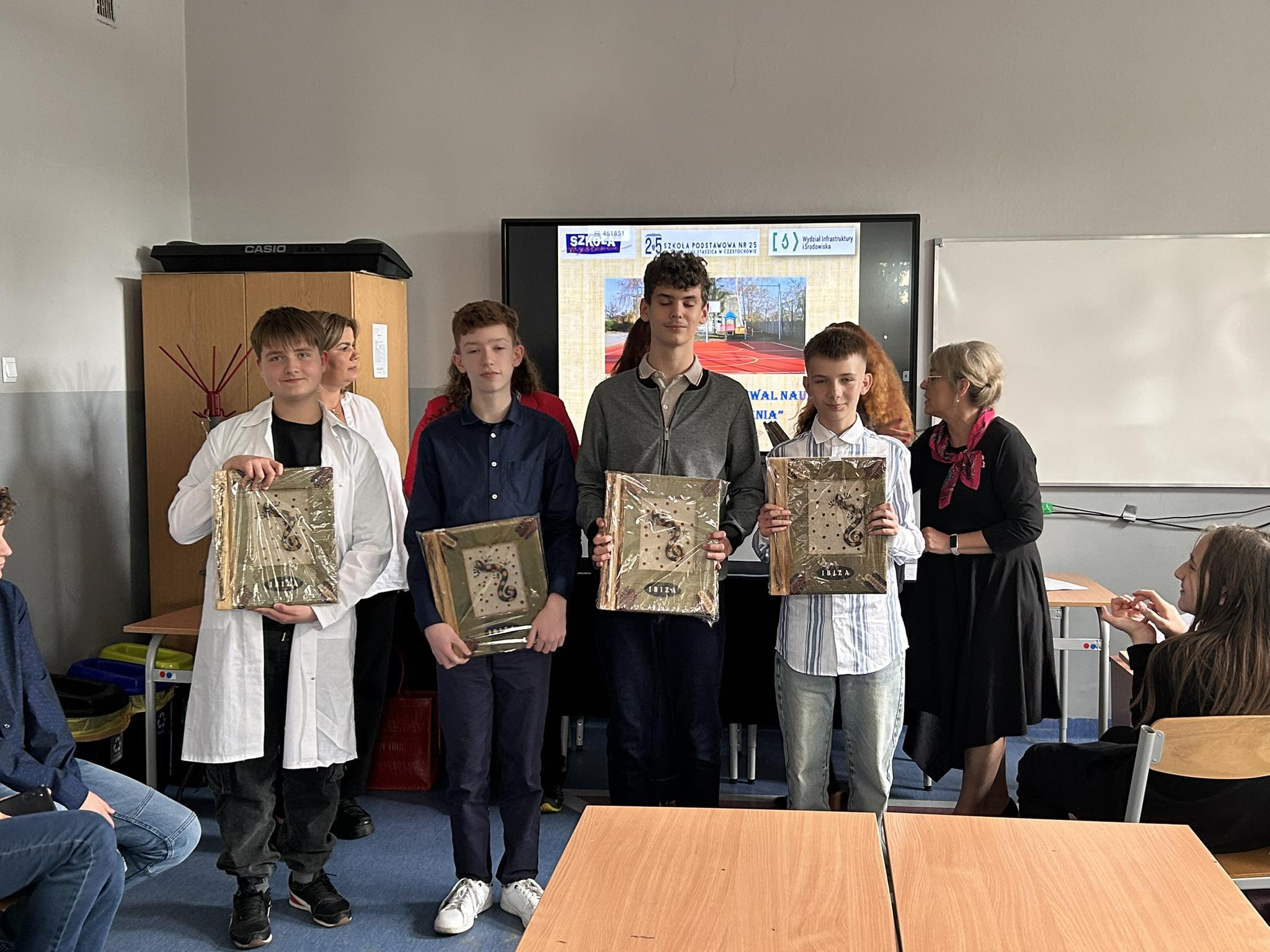 23 maja 2025 roku, czterech uczniów z klasy VI i VII reprezentowało naszą szkołę w VI Powiatowym Festiwalu Nauki „Szkoła Myślenia” organizowanym przez SP nr 25 w Częstochowie. Konkurs interdyscyplinarny łączy w sobie tematykę z zakresu matematyki i chemii, obejmuje wiedzę o patronach roku 2025, a także prezentację na temat przewodni, który co roku jest inny. Tym razem dotyczył odkryć i wynalazków, które zmieniły świat i nasze życie. Chłopcy wspaniale się zaprezentowali i choć znaleźli się tuż za podium, wykazali się olbrzymią wiedzą z zakresu kilku dziedzin oraz doskonałą współpracą podczas wykonywania kolejnych, bardzo trudnych zadań.
