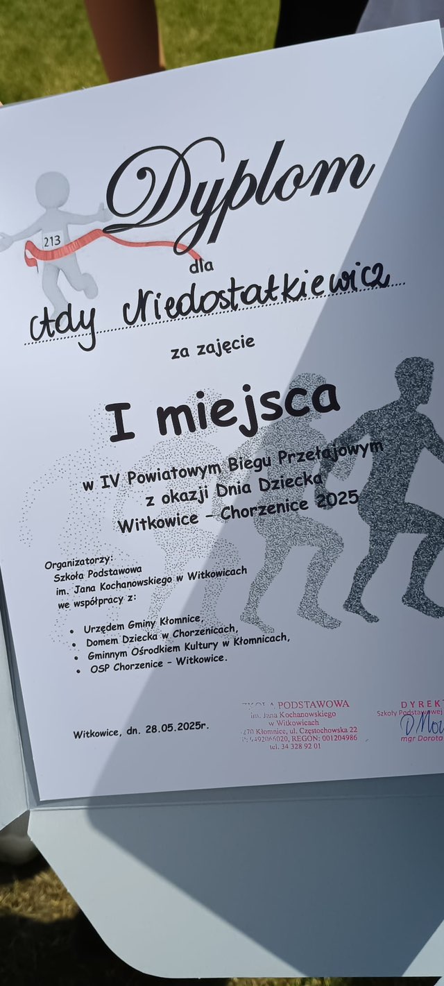 Uczniowie naszej szkoły brali udział w IV Powiatowym Biegu Przełajowym z okazji Dnia Dziecka, który odbył się 28 maja w Chorzenicach. Organizatorami zawodów jest Szkoła Podstawowa im. Jana Kochanowskiego w Witkowicach we współpracy z Urzędem Gminy Kłomnice, Domem Dziecka w Chorzenicach, Gminnym Ośrodkiem Kultury w Kłomnicach oraz OSP Chorzenice – Witkowice.Naszą szkołę reprezentowali: Mateusz Frankowski kl. 3b, Ignacy Muskalski kl. 3b, Filip Glica kl. 4b, Błażej Szczepańczyk kl. 4b, Alicja Koza kl. 5a, Lena Maroszek kl. 5a, Oskar Pichit kl. 5a, Nikola Grabara kl. 5b, Mikołaj Kościelniak kl. 7, Ada Niedostatkiewicz kl. 7, Filip Radecki kl. 7, Alan Resel kl. 7, Dawid Sosnowski kl. 7.Ogromne gratulacje dla Ady Niedostatkiewicz, która w swojej kategorii zajęła I miejsce!