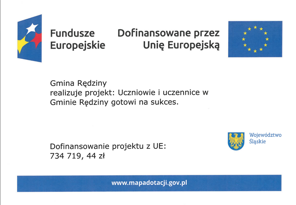 Projekt pn. „Uczniowie i uczennice w Gminie Rędziny gotowi na sukces” realizowany w ramach Fundusze Europejskie dla Śląskiego 2021-2027 (Europejski Fundusz Społeczny+) dla Priorytetu: FESL.06.00-Fundusze Europejskie dla edukacji dla Działania: FESL.06.02-Kształcenie ogólne.