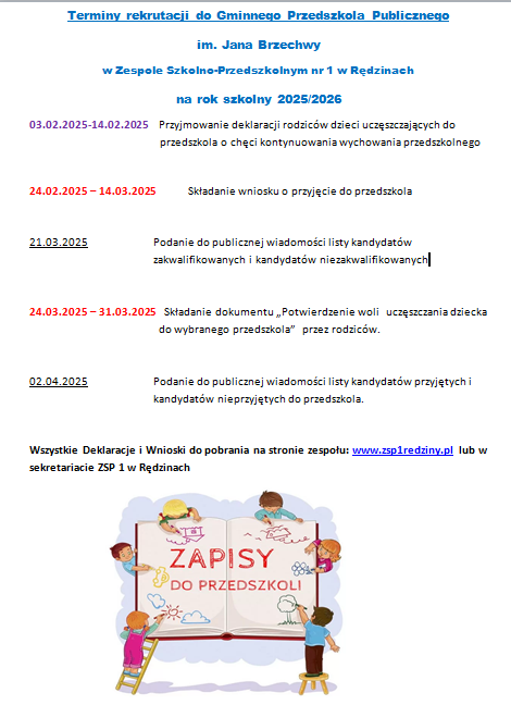 Wniosek o przyjęcie do Gminnego Przedszkola Publicznego im. J. Brzechwy w ZSP 1 w Rędzinach