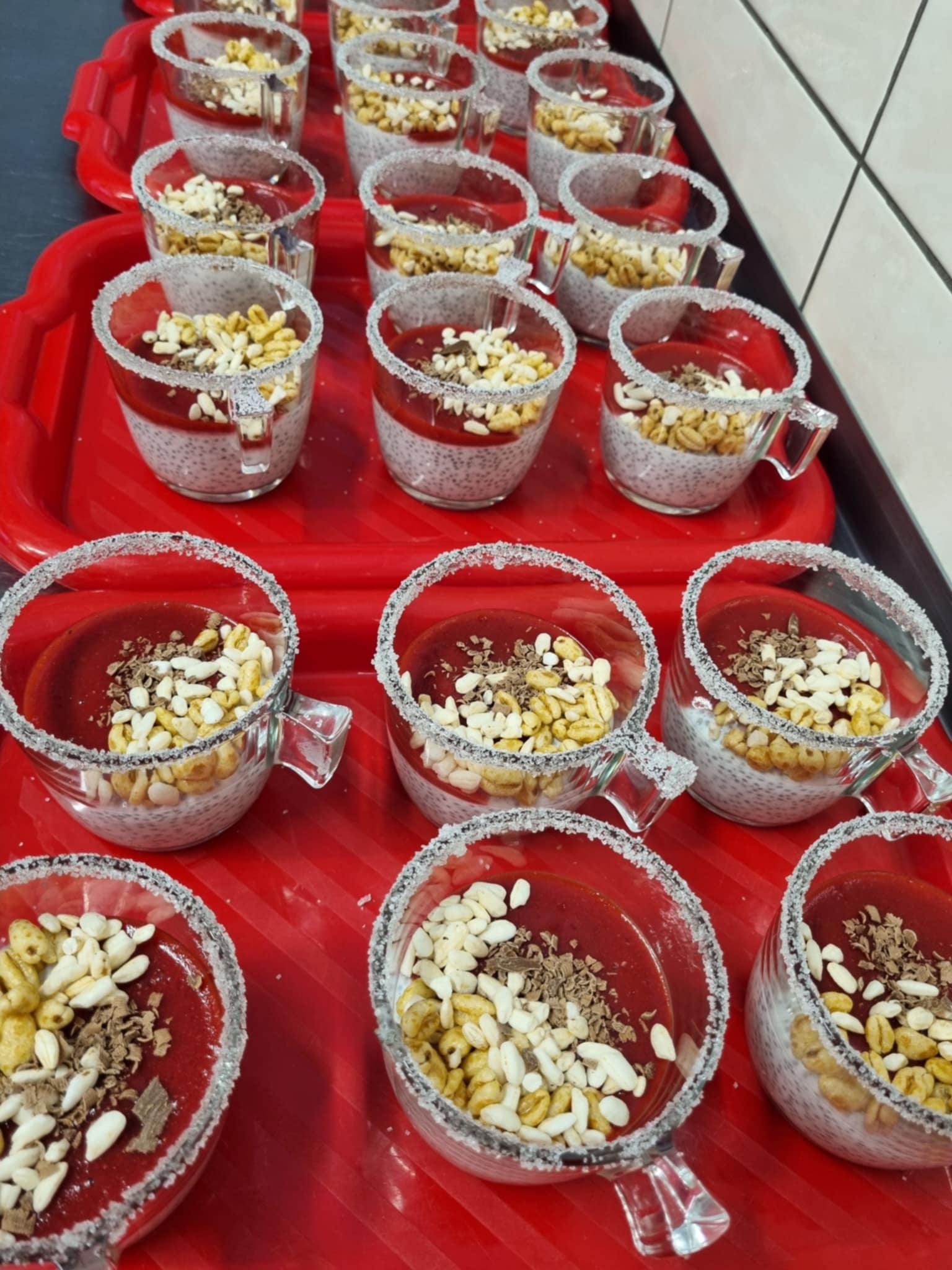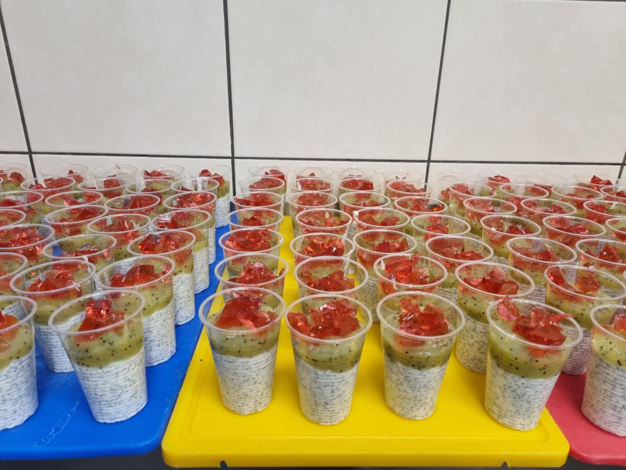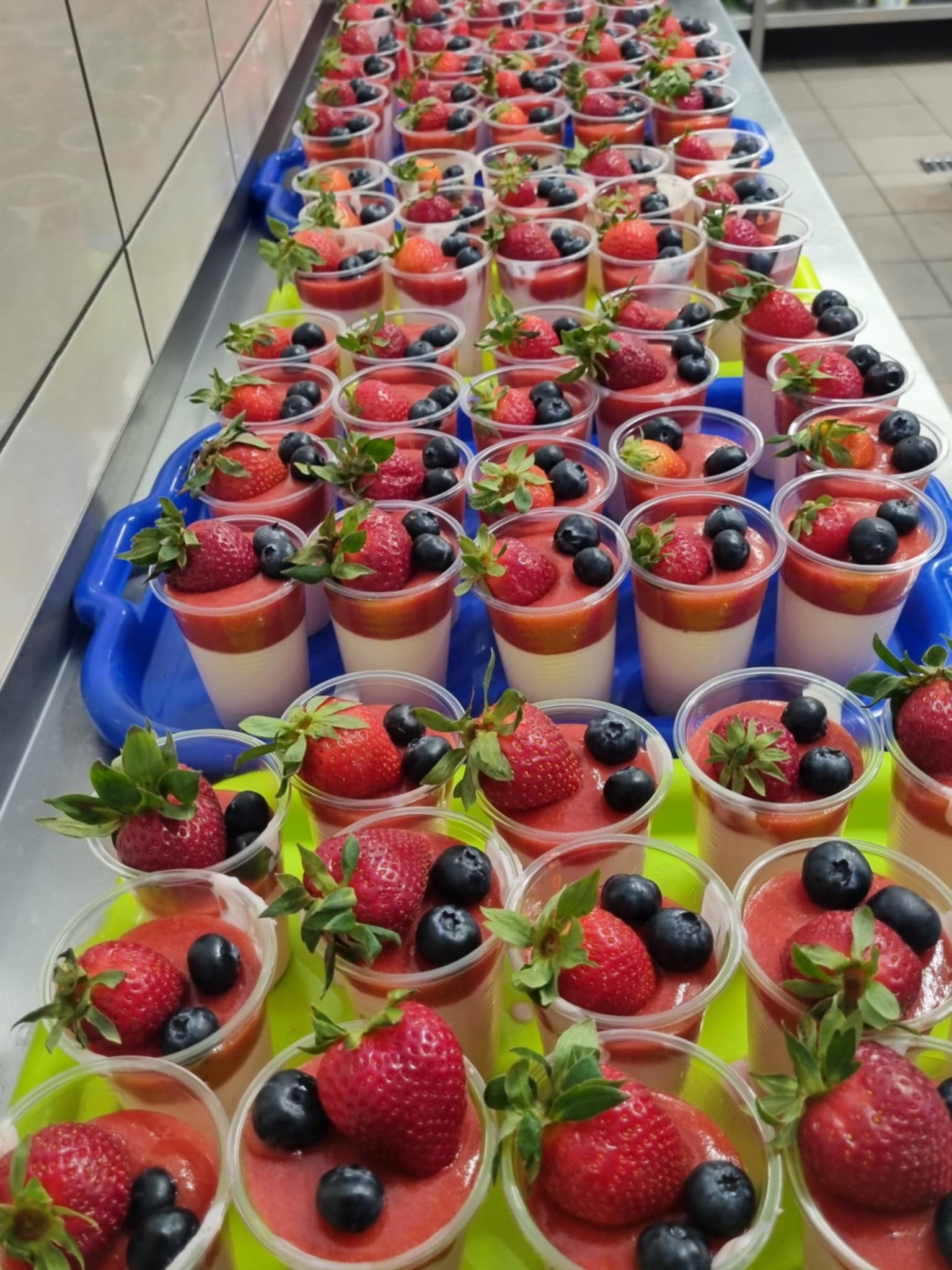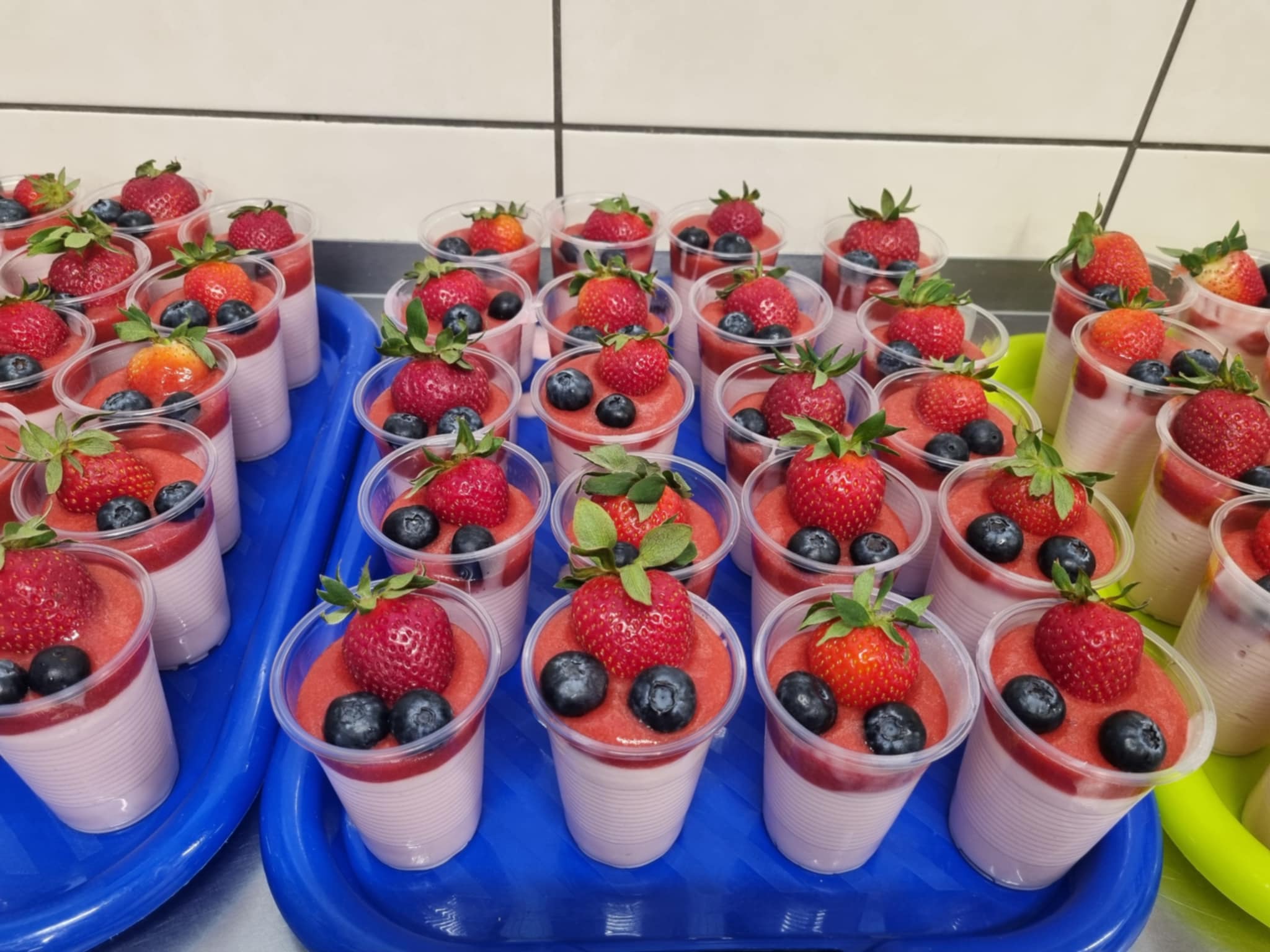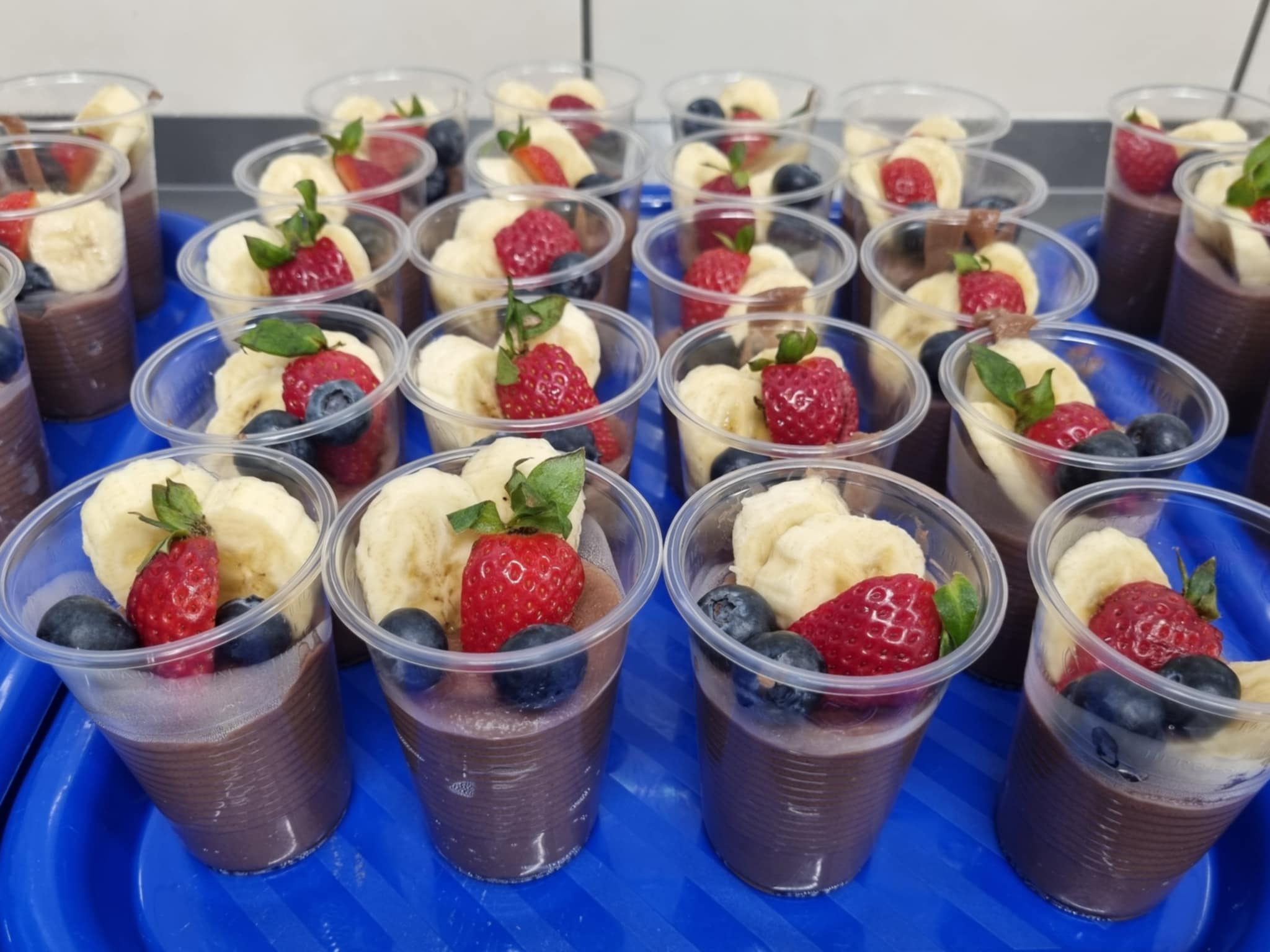 Nasz deser z kaszy jaglanej z truskawkami, bananem i borówkami to prawdziwa bomba witaminowa. Kasza jaglana nie zawiera glutenu, może zatem być spożywana przez osoby, które go nie tolerują. Jest zasadotwórcza, a więc wspomaga trawienie i pomaga w przywróceniu równowagi kwasowo-zasadowej. Kasza jaglana jest bogata w składniki odżywcze. Jest źródłem łatwo przyswajalnego białka, a także odznacza się wysoką zawartością witamin z grupy B, potasu, fosforu, magnezu czy cynku. Warto również wspomnieć że, spożywając kaszę jaglaną, dostarczamy do organizmu dużo więcej żelaza, którego w innych zazwyczaj zjadanych kaszach jest znacznie mniej. Owoce stanowią dobre źródło witaminy C, a jogurt jest skarbnicą żywych kultur bakterii fermentacji mlekowej. Obecność bakterii kwasu mlekowego w jogurcie wpływa na obniżenie pH w jelicie grubym, co sprzyja wchłanianiu wapnia, którego dużą ilość wprowadzamy do organizmu wraz z jogurtem. Wapń ma znaczenie w profilaktyce osteoporozy.